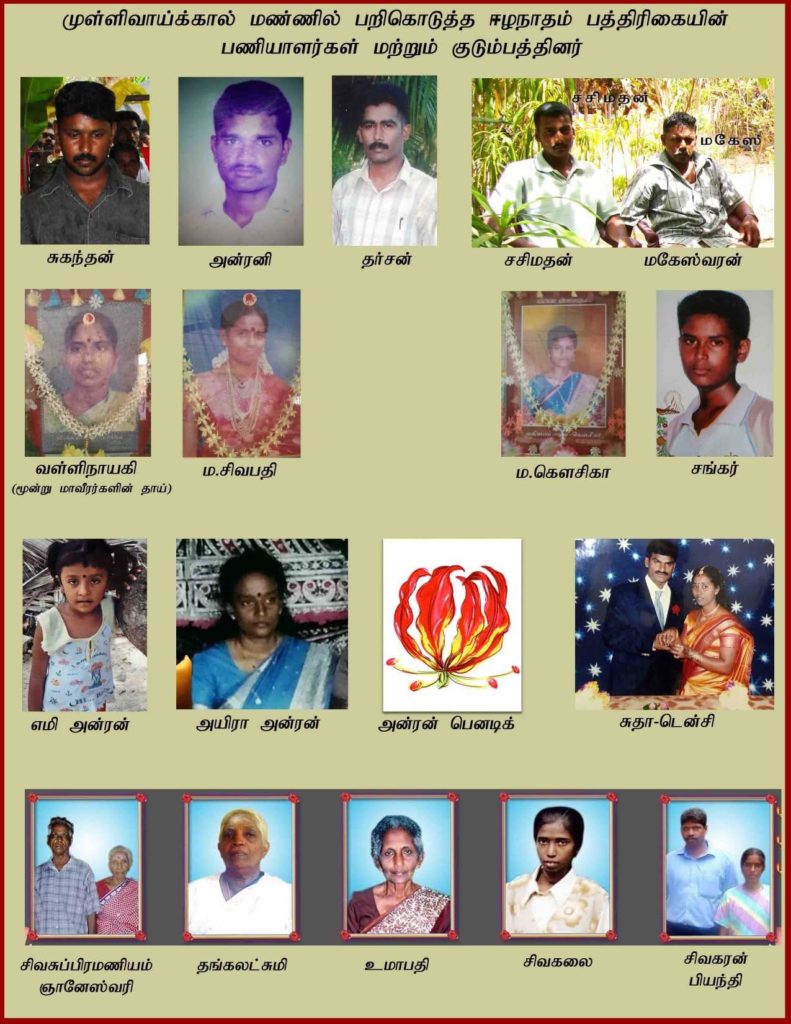 ஈழநாதம் பத்திரிகை நிறுவனத்தின் பொறுப்பாளர்களான மேஜர் அழகன், லெப்டினன்ட் கேணல் பார்த்தீபன், லெப்டினன்ட் கேணல் அன்புமணி ஆகியோருடன் உதவி ஆசிரியராக கடமையாற்றிய கப்டன் ஜெயேந்திரன், ஈழநாதம் பத்திரிகையின் நீண்டகால பணியாளரும் போர் உதவிப்படை வீரருமான சுகந்தன், மூத்த ஊடகவியலாளரும் நாட்டுப்பற்றாளருமான வ.அருள்சோதிநாதன் மற்றும் ஈழநாதம் மக்கள் நாளிதழின் வார வெளியீடான வெள்ளிநாதம் வெளியீட்டின் உதவி ஆசிரியரும் நாட்டுப்பற்றாளருமான ஜெயசீலன் ஆகியோர் தமது இன்னுயிரை ஆகுதியாக்கியுள்ளார்கள்.
