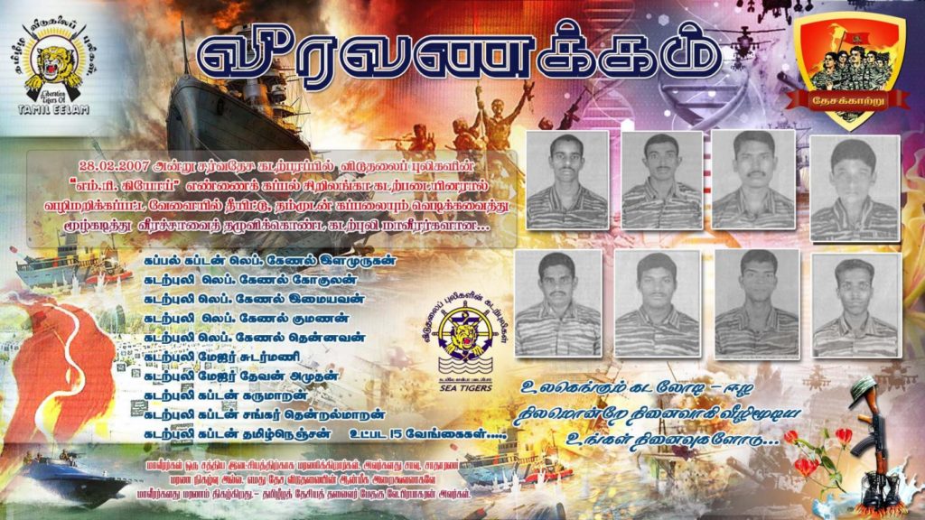 10.09.2007 – 11.09.2007 அன்று சர்வதேசக் கடற்பரப்பில் தமிழீழ விடுதலைக்கு பலம் சேர்க்கும் நடவடிக்கைகளில் ஈடுபட்டிருந்த விடுதலைப் புலிகளின் ‘எம்.ரி. மன்யோசி’ எண்ணைக்கப்பல் மற்றும் ‘எம்.வி.செய்சின்’, ‘எம்.வி.கொசியா’ ஆகிய வணிகக் கப்பல்களை சிறிலங்கா கடற்படையினர் பன்னாட்டு உதவிகளுடன் வழிமறித்த வேளையில் ஏற்பட்ட மோதலில் வீரச்சாவைத் தழுவிக்கொண்ட